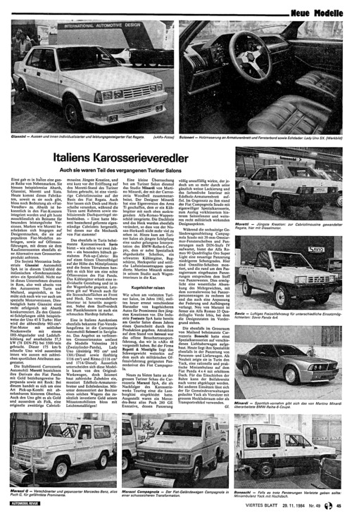 ... die sie auf populären Fiat-Modellen anbringen, sowie auf Offenaus^ führungen, mit denen sie dem Kaufinteressenten ebenfalls eine Alternative zum Grossserienprodukt anbieten. Die Societä Meccanica Industriale Giannini Automobili SpA ist in diesem Umfeld der italienischen «Sonderautoindustrie» ein Spezialfall. Nicht nur ist dieses Unternehmen drunten in Rom, also weit abseits von den Autozentren Turin und Mailand, angesiedelt, es bemüht sich nach wie vor auch um spezielle Motorversionen. Diesbezüglich hatte Giannini einst recht erfolgreich mit Abarth konkurrenziert. Zu den Giannini-Schöpfungen zählt beispielsweise der Uno 45 S Turbo: Hier wird der altbewährte 903-cm3- Fiat-Motor mit seitlicher Nockenwelle mit einem IHI-Abgaslader und Ladeluftkühlung auf ansehnliche 57,5 kW (78 DIN-PS) bei 5500/min gebracht. Dieser 175 km/h schnelle Uno wird ausserdem innen wie aussen mit zahlreichen sportlichen Attributen ausgestattet. Die Stabilimenti Carrozzeria Automobili Moretti bezeichnen ihre Derivate des Fiat Panda mit Gold beziehungsweise Superpanda sowie mit Rock: Bei diesem handelt es sich um eine Art Pickup-Kombi mit abnehmbarem hinterem Oberbau. Auch den Uno gibt es als Gold und ausserdem als Folk, eine originelle zweitürige Cabriolimousine. Jüngste Kreation, und erst kurz vor der Eröffnung auf den Moretti-Stand des Turiner Salons gebracht, ist ...