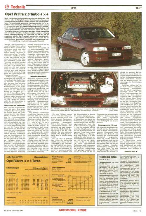 ... dotierten Benzinmotor aus dem Hause Opel diente der bewährte Zweiliter-Sechzehnventiler, dessen Leistungmittels Zwangsbeatmung und Feinschliff von 150 auf 204 PS angehoben wurde. Das Triebwerk wartete im geprüften Allrad-Vectra mit brillanten Fahrleistungen auf, womit die für 42 700 Franken angebotene Limousine mit umfassender Serienausstattung ein attraktives Angebot darstellt. Mit dem 1988 vorgestellten Ascona-Nachfolger Vectra schloss Opel die Lücke zwischen demmittlerweile durch den Astra abgelösten Kadett und demOmega, und ein Jahr später ergänzte das auf der Vectra-Bodengruppe aufgebaute CoupeCalibra das Angebot. Für Distanz zum Kadett bzw. Astra mit Stufenheck sorgen beimVectra die mit 443 cm um rund 20 cm grössere Gesamtlänge sowie der 8,5 cm längere Radstand von 260 cm, währendBreite und Höhe nur minim abweichen. Aber auch gegenüberdem deutlich grösseren Omega bleibt die Eigenständigkeit desVectra gewährleistet. Nicht so deutlich abgegrenztpräsentierte sich bisher die vorwiegend auch im Kadett/Astrazu findende Motorenpalette, aber dies holte Opel nun beimModelljahr 1993 nach: Bereits kommerzialisiert ist die Turboversion des bewährten 2.0 16V,und nach der Jahreswende kommt ein kompakter V6 2.5mit 170 PS hinzu. Dieses Aggregat schliesst eine echte Lücke imAngebot, eignen sich doch die hauseigenen Reihen-Sechszylinder von Omega und Senator ...