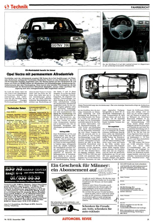 ... 000 km; Jeep CJ-7 6-Zyl. 5 Gang 83, Druckluftbremse; Jeep Wagoneer 12. 78, 97 000 km, Vakuumbremse; Jeep 3 JB Militär 53, MFK 88; Toyota Hi-Lux 2.2 Diesel Versa Lift, neuwertig, 550 km; Mitsubishi Pajero 2.6 B 83, 55 000 km, HT, ST; Mitsubishi Pajero 2.6 B 83, 65 000 km, Metal Top; Toyota Hiace4x4, neuwertig; AMC Eagle 11.82, MFK 3.88, 60 000 km, günstig; Toyota Land-Cruiser Turbo Diesel 86, 37 000 km; International Scout II 79, Cabriolet, 95 000 km; Chevi Blazer K5 79, rotsilber, 98 000 km; Subaru Justy J 12 GL 12. 87, 23 000 km. 6209r Jeep-CJ-7-Ausstellung. Alle Wagen ab MFK, Garantie, Leasing, Teilzahlung. Ein Geschenk für Männer: ein Abonnement auf Schenken Sie Freude am Auto, schenken Sie auto exklusiv Ich will Freude am Auto schenken und bestelle ein Jahresabonnementauf auto exklusiv zum Preis von Fr. 72.— (12 Ausgaben) als Geschenkfür Dieses Angebot ist nur für dieSchweiz gültig. Auslandskonditionen auf Anfrage. Bitte einsenden an: auto exklusiv,Vertriebsabteilung, Nordring 4, 3001 Bern Im Laufe der letzten Jahre hat sich vorab in den Alpenländern ein Trend zum «Allradler» herauskristallisiert, dem mittlerweile fast alle Hersteller durch unterschiedlichste Lösungen Rechnung getragen haben. Opel stösst mit dem Vectra 4x4 zwar relativ spät zum Kreis der Anbieter, kann dafür aber mit einem Antriebskonzept aufwarten, das sich durch zahlreiche technische ...