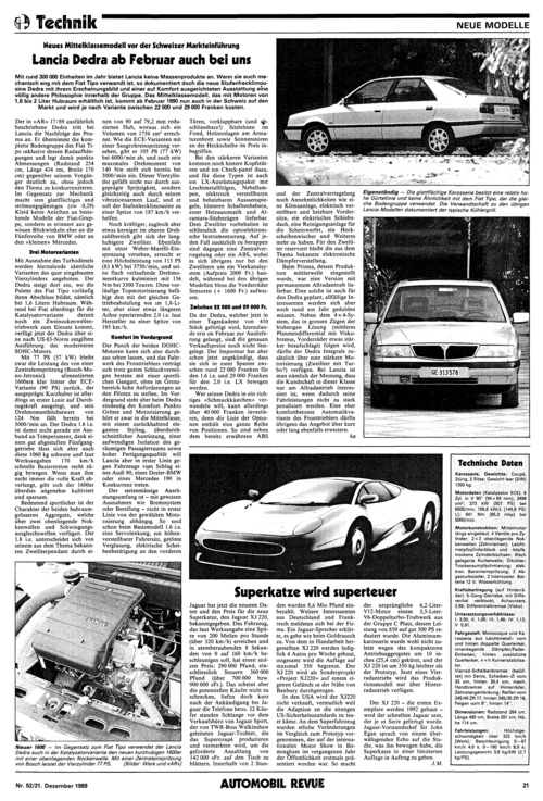 ... der Vierzylinder 77 PS. (Bilder- Werk und «AR*) Der in «AR» 17/89 ausführlich beschriebene Dedra tritt bei Lancia die Nachfolge des Prisma an. Er übernimmt die komplette Bodengruppe des Fiat Tipo inklusive dessen Radaufhängungen und legt damit punkto Abmessungen (Radstand 254 cm, Länge 434 cm, Breite 170 cm) gegenüber seinem Vorgänger deutlich zu, ohne jedoch den Thema zu konkurrenzieren. Im Gegensatz zur Mechanik macht sein glattflächiges und strömungsgünstiges (cw 0,29) Kleid keine Anleihen an bestehende Modelle der Fiat-Gruppe, sondern es erinnert aus gewissen Blickwinkeln eher an die Fünferreihe von BMW oder an den «kleinen» Mercedes. Mit Ausnahme des Turbodiesels werden hierzulande sämtliche Varianten des quer eingebauten Vierzylinders angeboten. Der Dedra steigt dort ein, wo die Palette des Fiat Tipo vorläufig ihren Abschluss bildet, nämlich bei 1,6 Litern Hubraum. Während bei Fiat allerdings für die Katalysatorvariante derzeit noch ein Zweinockenwellentriebwerk zum Einsatz kommt, verfügt jetzt der Dedra über eine nach US-83-Norm entgiftete Ausführung des moderneren SOHC-Motors. Mit 77 PS (57 kW) bleibt zwar die Leistung des von einer Zentraleinspritzung (Bosch-Mono-Jetronic) alimentierten 1600ers klar hinter der ECE- Variante (90 PS) zurück, der ausgeprägte Kurzhuber ist allerdings in erster Linie auf Durchzugskraft ausgelegt, und sein ...