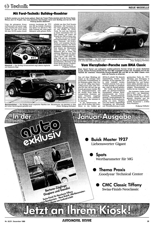 ... steckt solide Technik aus dem Ford Sierra. Mit dem 120 PS starken Zweilitermotor bescheinigt der TÜV dem 800 kg leichten Zweisitzer eine Spitze von 200 km/h. Wer mehr Leistung will, kann gegen Mehrpreis auch grössere Sechszylinder aus dem Ford Scorpio bekommen. Alle Versionen haben einen geregelten Katalysator und erfüllen die US-SB- Norm. Da auch das Fahrwerk zu einem wesentlichen Teil von Ford stammt, soll zudem auf Wunsch das ABS zu haben sein. Im Preis von etwa 42 500 DM .sind Speichenräder, ein verstellbares Fahrwerk, 185/70-R13- Reifen und komplette Sportinstrumente enthalten. Das handgearbeitete Edelholzarmaturenbrett könnte das Meisterstück eines Schreiners sein. Gegen Mehrpreis gibt es neben den stärkeren Maschinen ein Hardtop (1200 DM) und lederüberzogene Sitze (1800 DM). Anfang 1990 soll ein viersitziger Bulldog mit längerem Radstand hinzukommen. Hersteller ist die Firma Hardy-Motors, Franklinstrasse 15, D-1000 Berlin 10. Nun soll dieser Blickfang mit einigen an die sechziger Jahre erinnernden Formelementen in die Kleinserie gehen. Zum Umbau auf die völlig neue Kunststoffkarosserie kann jeder Porsche 924 oder 944 neu oder gebraucht genommen werden. Mit den Klappscheinwerfern und der flachen Front findet der hochsportliche Zweisitzer auf jedem Parkplatz neugierige Blicke. Das - noch - unbekannte Auto weckt das Interesse ...