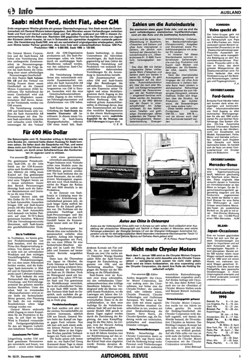 ... erscheinen stets gegen Ende Jahr, und sie sind die wohl vollständigsten statistischen Veröffentlichungen Autos aus der Volksrepublik China sieht man in Europa nur sehr selten. Doch anlässlich einer Ausstellung der chinesischen Wissenschaft und Technik in Polen wurden in Warschau zwei solche Fahrzeuge präsentiert: der Shanghai Santana LX von der Shanghai-Volkswagen Automotive Corporation und der für devi osteuropäischen Markt besonders interessante Kleintransporter Tianjin TJ 110, der in der Tianjin Small fyehicle F\ctory auf Daihatsu-Basis gebaut wird. ". .. (P. H./Fotos: Pawel Przygodzki) Nach dem 1. Januar 1990 wird es die Chrysler Motors Corporation — Achtung, das ist nicht dasselbe wie die Chrysler Corporation! — wenigstens nach aussen hin nicht mehr geben. Doch wird sie intern fortbestehen, als eine «operating unit» der Chrysler Corporation, die damit ihre Rolle als Holding Gesellschaft aufgibt. Die General Motors Corporation und die Saab-Scania AB haben eine Vereinbarung über eine umfangreiche Zusammenarbeit im Personenwagengeschäft getroffen. Als Folge davon hat Saab-Scania die Gründung einer neuen selbständigen Personenwagen-Gesellschaft mit dem Namen Saab Automobile AB und den Verkauf von fünfzig Prozent dieser neuen Gesellschaft an die General Motors Corporation (GM) beschlossen. Der Aufsichtsrat der neuen Gesellschaft wird sich aus ...