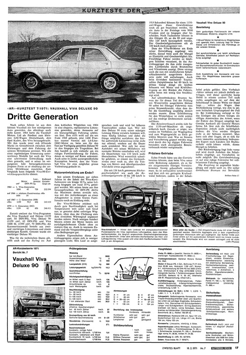 ... 90. Was für die technischen Daten gilt, trifft auch auf das Styling zu: Aus dem kubischen Wägelchen von 1964 ist eine elegante, repräsentative Limousine geworden, deren Aeusseres auf ein leistungsfähiges Fahrzeug schliessen lässt. Dies trifft wohl auf die seit Ende 1968 gebaute, jetzt 1400 Franken teurere Version mit 1,6-Liter- OHC-Motor zu, beim uns für den Test zur Verfügung gestellten Deluxe 90 ist dies hingegen ein Trugschluss. Bei ihm handelt es sich vielmehr um ein ruhiges Familienfahrzeug für Fahrer, denen es weniger auf Rasse ankommt. Auch seine in nichts außergewöhnliche Konzeption beweist, dass der Vauxhall Viva für eine möglichst grosse Verbreitung gedacht ist. Seit seinem Erscheinen ypr sieben Jahren ist der Inhalt des" Viva-Xurzhubmotors um knapp 10%, seine Leistung hingegen um rund 35 % gesteigert worden. Mit seinen heute aus ihm herausgebrachten 62 DIN-PS dürfte das Maximum dessen erreicht sein, was mit den Anforderungen an einen Alltagsmotor in einem braven Familienauto noch im Einklang steht. Der Viva-90-Motor zeichnet sich durch gute Startfreudigkeit auch bei Temperaturen weit unter null Grad aus; er gestattet dabei sofortiges Wegfahren, ohne dass der Chokezug stets dem erreichten Wärmegrad angepasst werden müsste. Nach wenigen hundert Metern nimmt der Motor bereits mit zurückgeschobenem Choke ohne zu stottern Gas an. Auch in ...
