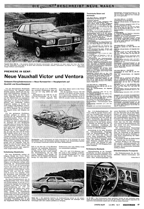 ... sprüchen genügen zu können, hat Vauxhall bei der Modernisierung der Vierzyliridermodelle Victor und der Sechszylinder-Ventoras enger als bisher üblich mit Opel zusammengearbeitet. Nachdem die neue Modellreihe von Opel schon im Januar der Oeffentlichkeit präsentiert worden ist, können auch schon erste Vergleiche zwischen dem Rekord II und dem englischen Pendant, dem Victor, angestellt werden. Es zeigt sich, dass sich die beiden GM-Produkte stärker als je zuvor ähneln. Die Zusammenarbeit zwischen Vauxhall und Opel, die bis auf Arbeitsteilung auf einzelnen Gebieten hinausging, ist besonders beim Betrachten der Rohkarosserie augenfällig: die Bodengruppe und die tragenden Teile der Karosserie sind mit denen des Rekord nahezu identisch. Front-, Seitenund Heckscheiben können sogar gegeneinander ausgewechselt werden. Die neue Modellreihe umfasst als billigstes Modell den Victor Deluxe mit 1759-cm3-Vierzylindermotor, den Victor 2300 SL (2279 cm3), den sportlichen VX 4/90, der über eine leistungsfähigere 2,3-L-Maschine verfügt, sowie schliesslich die Sechszylindermodelle Victor 3300 SL und die Luxusvariante Ventora, die ausser mit der 3,3-L-Maschine auch mit einem neuen 2,8-L-Motor ausgerüstet werden können. Victor Deluxe, 2300 und 3300 SL werden auch als Estate Cars aufgelegt, wobei das Rombiheck stark demjenigen des Viva Estate gleicht. Wie bisher führt ...