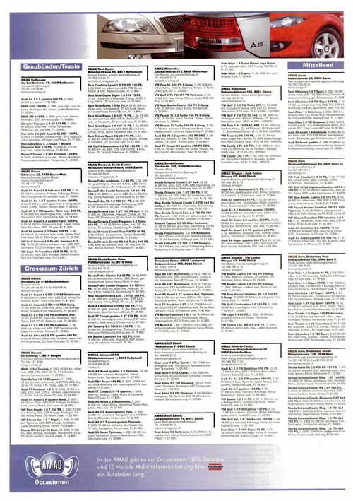 [email protected] Tel. 044 908 60 40mofag.ch Audi A4 Avant quattro 2.8 Tiptronic, 10. 00,105 000 km, schwarz, Navigation, Xenon, Recaro-Leder, Sportpaket usw.. Fr. 27 900.-Audi RS4 Avant 498 PS, 8. 2001, 27 000 km, rot, Vollausstattung inkl. Leistungsstufe III, neuwertig, Fr. 87 900- Audi TT Coupe 225 PS quattro, 4. 2004,9500 km, schwarz, Leder, Klima, S-Fahrwerk, Radio/CD usw.. Fr. 41 900.-Audi A6 Avant 2.8 Multitronic, 2. 2001, 84 000 km, silber, Klima, Tempomat, Radio-Navigation, Holz usw.. Fr. 27 900.- Audi A6 2.8 Avant quattro Tiptr., 3. 2001,66 000 km, cashmere, Navigation plus mit Bose- Sound, SD, Leder, Xenon usw.. Fr. 39 900.-AMAG SEAT Zürich,Luegislandstrasse 76, 8051 Zürich Kevin Banz,