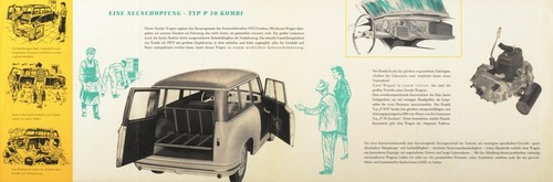 ... Kombiwagen kann vielseitig Verwen dung finden. Personen und Waren werden zugleich befördert. Audi in der Landwirtschaft ist der Kombi wagen ein treuer Helfer. Zum Wochenend bietet der Kombiwagen Freude und Entspannung. Dieser Kombi-Wagen ergänzt das Bauprogramm des Automobilwerkes AWZ Zwickau. Mit diesem Wagen über geben wir unseren Käufern ein Fahrzeug, das mehr bietet, als gemeinhin erwartet wird. Ein großer Laderaum durch die breite Hecktür bietet ausgezeichnete Beladefähigkeit als Nutjfahrzeug. Die schnelle Umstellmöglichkeit des Kombi als PKW mit großem Gepäckraum, in dem mühelos und leicht zugänglich alles für Geschäft und Beise untergebracht werden kann, macht diesen Wagen zu einem wirklichen Gebrauchsfahrzeug. EII\E NEU SCHÖPFUNG TYP P 70 KOMBI Der Kombi besitit die gleichen angenehmen Fahreigen schaften der Limousine, man empfindet kaum einen Unterschied. Zwei Wagen in einem vereint, das sind die großen Vorteile eines Kombi-Wagens. Eine zweckentsprechende Konstruktion der Sitje bietet Gelegenheit, sie mit wenigen Handgriffen als Liege stätte für zwei Personen umzuwandeln. Der Kombi Typ „P 70 K“ besitzt den gleichen strapazierfähigen und leistungsgesteigerten 690 ccm-Motor wie die Limousine Typ „P 70 Zwickau“. Seine formschöne stabile Plastik- Karosserie gibt dem Wagen ein elegantes Äußeres Der neue Karosseriebaustoff, eine hervorragende ...
