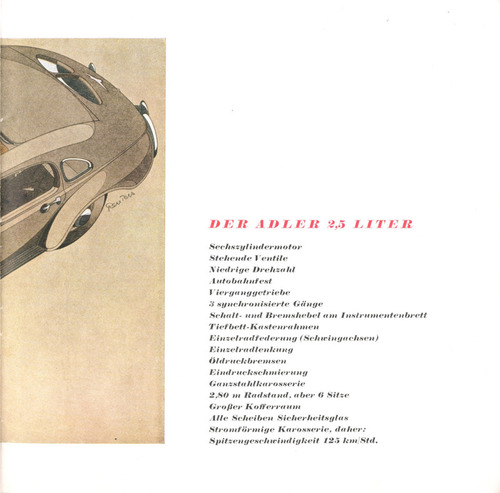 ... E R A D L E R 2,5 L I T E R Sechszylindermotor Stehende I entile Niedrige Drehzahl Autoba h nfest Y'ierga nggetriebe -£ synchronisierte Gänge Schaltand Bremshebel am Instrumentenbrett T i efbett-K a stenra h men Einzelradfederung (Schwingachsen) Einzelradlenkung Öldruckbremsen Eindruckschmier ting Ganzstahlkarosserie 2,80 m ltadstand, aber (i Sitze Großer Kofferraum Alle Scheiben Sicherheitsglas Stromförmige Karosserie, daher: Spitzengeschwindigkeit 125 km/Std. ...