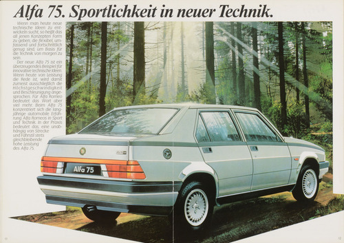 ... in neuer Technik. Alfa 75. Wenn man heute neue technische Ideen zu ent wickeln sucht, so heißt das all jenen Konzepten Form zu geben, die flexibel, um fassend und fortschrittlich genug sind, um Basis für die Technik von morgen zu sein. Der neue Alfa 75 ist ein überzeugendes Beispiel für innovative technische Ideen. Wenn heute von Leistung die Rede ist, wird damit zumeist ausschließlich die H öchstgeschw ind igke it und Beschleunigung ange sprochen. Für Alfa Romeo bedeutet das Wort aber viel mehr. Beim Alfa 75 konzentriert sich die lang jährige automobile Erfah rung Alfa Romeos in Sport und Technik. In der Praxis bedeutet das, eine unab hängig von Strecke und Fahrstil stets gleichbleibende hohe Leistung des Alfa 75. ...