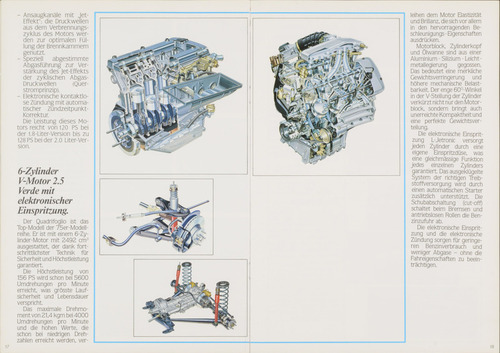 ... Ansaugkanäle m it Jet- Effekt“: die Druckwellen aus dem Verbrennungs zyklus des Motors wer den zur optimalen Fül lung der Brennkammern genutzt. - Speziell abgestimmte Abgasführung zur Ver stärkung des Jet-Effekts der zyklischen Abgas- Druckwellen (Quer stromprinzip). - Elektronische kontaktlo se Zündung mit automa tischer Zündzeitpunkt- Korrektur. Die Leistung dieses Mo tors reicht von 120 PS bei der 1.8-Liter-Version bis zu 128 PS bei der 2.0 Liter-Ver sion. 6-Zylinder V-Motor Verde mit elektronischer Einspritzung. Der Quadrifoglio ist das Top-Modell der 75er-Modellreihe. Er ist mit einem 6-Zylinder-Motor mit 2492 cm3 ausgestattet, der dank fort schrittlichster Technik für Sicherheit und Höchstleistung garantiert. Die Höchstleistung von 156 PS wird schon bei 5600 Umdrehungen pro Minute erreicht, was grösste Lauf sicherheit und Lebensdauer verspricht. Das maximale Drehmo ment von 21,4 kgm bei 4000 Umdrehungen pro Minute und die hohen Werte, die schon bei niedrigen Dreh zahlen erreicht werden, ver leihen dem Motor Elastizität und Brillanz, die sich vor allem in den hervorragenden Beschleunigungs - Eigenschaften ausdrücken. Motorblock, Zylinderkopf und Ölwanne sind aus einer Aluminium - Silizium - Leicht metallegierung gegossen. Das bedeutet eine merkliche Gewichtsverringerung und höhere mechanische Belast barkeit. ...