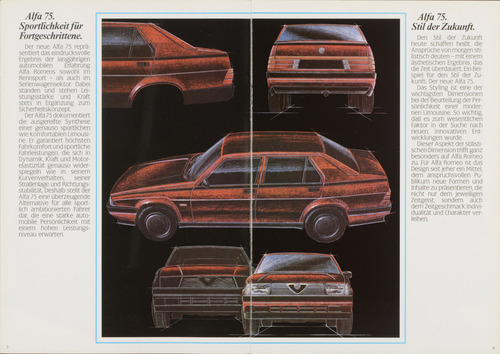 ... 75. Sportlichkeit für Fortgeschrittene. Der neue Alfa 75 reprä sentiert das eindrucksvolle Ergebnis der langjährigen automobilen Erfahrung Alfa Romeos sowohl im Rennsport - als auch im Serienwagensektor. Dabei standen und stehen Lei stungsstärke und Kraft stets in Ergänzung zum Sicherheitskonzept. Der Alfa 75 dokumentiert die ausgereifte Synthese einer genauso sportlichen wie komfortablen Limousi ne. Er garantiert höchsten Fahrkomfort und sportliche Fahrleistungen, die sich in Dynamik, Kraft und Motor elastizität genauso wider spiegeln wie in seinem Kurvenverhalten, seiner Straßenlage und Richtungs stabilität. Deshalb stellt der Alfa 75 eine überzeugende Alternative für alle sport lich ambitionierten Fahrer dar, die eine starke auto mobile Persönlichkeit mit einem hohen Leistungs niveau erwarten. Stil der Zukunft. Den Stil der Zukunft heute schaffen heißt, die Ansprüche von morgen sti listisch deuten - m it einem ästhetischen Ergebnis, das die Zeit überdauert. Ein Bei spiel für den Stil der Zu kunft: Der neue Alfa 75. Das Styling ist eine der wichtigsten Dimensionen bei der Beurteilung der Per sönlichkeit einer moder nen Limousine. So wichtig, daß es zum wesentlichen Faktor in der Suche nach neuen, innovativen Ent wicklungen wurde. Dieser Aspekt der stilisti schen Dimension trifft ganz besonders auf Alfa Romeo zu. Für ...