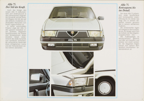 ... 75. Der Stil der Kraft. Auch das Design des neuen Alfa 75 dokumen tiert sich eindrucksvoll in den Dimensionen Originali tät, Dynamik und der linea ren Eleganz. Ein Stil, der auf den aktiven, modernen, in dividuellen Menschen von heute zugeschnitten ist. ln seiner automobilen Präsenz zeigt der Alfa 75 den ganzen Charakter ei ner sicheren, eleganten Sportlimousine mit Klasse und Temperament. Jedes einzelne Detail unter streicht die vitale Dynamik und sportliche Dominanz, die wesentliche Merkmale eines erfolgreichen Autos und der Persönlichkeit sei nes Fahrers darstellen. Alfa 75. Konsequenz bis ins Detail. Der neue Alfa 75 präsen tiert vitale Sportlichkeit und konsequente Linien führung bis ins Detail. Das zeigt sich in seinem ele ganten Inneren genauso wie in seinem attraktiven Äußeren. Die Scheinwerfer fügen sich elegant in die Frontpar tie ein, ihr Design setzt sich als Einheit m it den Begren zungsleuchten fort. Der Außenspiegel ist aerodynamisch geformt und läßt sich bequem und präzise von innen verstel len. Die eleganten Felgen passen sich optisch dem sportlichdominanten Ge samteindruck an. ...
