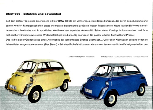 ... 600 - gefahren und bewundert Seit dem ersten Tag seines Erscheinens gilt der BMW 600 als ein vollwertiges, viersitziges Fahrzeug, das durch seine Leistung und seinen Komfort Fahreigenschaften bietet, wie man sie bisher nur bei größeren Wagen finden konnte. Heute ist der BMW 600 ein viel tausendfach bewährtes und in sportlichen Wettbewerben erprobtes Automobil. Seine vielen Vorzüge in konstruktiver und fahr technischer Hinsicht sowie seine Wirtschaftlichkeit sind allseitig anerkannt. So positiv urteilen Fachwelt und Presse: Das ist bei dieser Größenklasse eines Automobils der vernünftigste Einstieg überhaupt... Unter allen Kleinwagen scheint er der am liebevollsten ausgestattete zu sein. (Der Stern.) - Bei einer Probefahrt konnten wir uns von den erstaunlichen Fahreigenschaften des . und so reichhaltig ist die Farbauswahl: Einfarbig: weißgold »azurblau korallenrot »türkis cortinagrau »federweiß ...