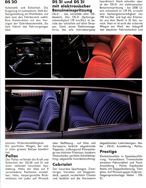 ... Automatik und Sicherheit. Die Kupplung ist automatisch. Statt der Gangschaltung ein Wahlhebel, mit dem man den Fahrbereich wählt. Eine Konstruktion mit den Vor zügen der Getriebeautomatik, die dem Fahrer das Fahrvergnügen lässt. DS2I und DS2I mit elektronischer Benzineinspritzung DS-21 - das schnellste aller DS- Modelle. Der DS-21 (Spitzenge schwindigkeit 178 km/Std.) ist be reits der schnellste auf allen Stras sen. Dank seines Elektronenge hirns, das alle Antriebsorgane koordiniert. Noch schneller aber ist der DS-21 mit elektronischer Benzineinspritzung : bei 5500 U/ min entwickelt er 139 PS, erreicht eine Spitzengeschwindigkeit von 190 km/Std. und legt den Kilome ter aus dem Stand in 35 Sek. zu rück. Aber er ist auch der sicherste Wagen der Welt, der Inbegriff von absoluter Fahrsicherheit und höchster Widerstandsfähigkeit. Ein sportlicher Wagen, der sich in allen grossen Rallyes bewährt hat. Pallas Der Pallas verbindet die Kraft und Sicherheit der DS-20 und 21 mit einer vollendet luxuriösen Aus stattung. Höhe der Sitze auf 9 verschiedene Positionen einstell bar; höhe, körpergerechte Rück enlehnen mit Leder auf Wunsch oder Stoffbezug ; auf Sitze und Karosserie farblich abgestimmte Teppiche; Lüftungsund Klimaanla ge von höchster Präzision; heizbare Heckscheibe; perfekte Schalldämp fung; abgestufte Innenbeleuchtung. Cabriolet ...