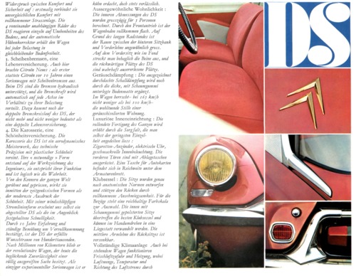 ... der Werkzeichnung des Ingenieurs, sie entspricht ihrer Funktion und ist logisch wie die Wahrheit. Von den Kennern der ganzen Welt gerühmt und gepriesen, wirkt sie inmitten der zeitgenössischen Formen als der modernste Ausdruck der Schönheit. Mit seiner windschlüpfigen Stromlinienform erscheint uns selbst ein abgestellter DS als die im Augenblick festgehaltene Schnelligkeit. Durch 10 Jahre Erfahrung und ständige Bemühung um Vervollkommnung bestätigt, ist der DS der erfüllte Wunschtraum von Hunderttausenden. Nach Millionen von Kilometern blieb er der revolutionäre Wagen, der heute die beglückende Zuverlässigkeit einer völlig ausgereiften Sache besitzt. Als einziger experimenteller Serienwagen ist er kühn erdacht, doch stets verlässlich. Aussergewöhnliche Wohnlichkeit : Die inneren Abmessungen des DS wurden gross^ügig für j Personen berechnet. Durch den Frontantrieb ist der Wagenboden vollkommen flach. Auf Grund des langen Radstandes ist der Raum ^wischen der hinteren Sitzbank und Vorderlehne ungewöhnlich gross. Auf dem Vordersitz wie im Fond streckt man behaglich die Beine aus, und die rückwärtigen Plätze des DS sind wahrhaft ausererlesene Plätze. Geräuschdämpfung : Die ausgezeichnet durchdachte Schalldämpfung wird noch durch die dicke, mit Schaumgummi unterlegte Bodenmatte ergänzt. Im Wagen herrschtbei 16j km/h nicht weniger als bei ...