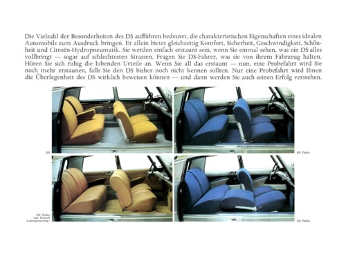 ... Vielzahl der Besonderheiten des DS aufführen bedeutet, die charakteristischen Eigenschaften eines idealen Automobils zum Ausdruck bringen. Er allein bietet gleichzeitig Komfort, Sicherheit, Geschwindigkeit, Schön heit und Citroen-Hydropneumatik. Sie werden einfach erstaunt sein, wenn Sie einmal sehen, was ein DS alles vollbringt — sogar auf schlechtesten Strassen. Fragen Sie DS-Fahrer, was sie von ihrem Fahrzeug halten. Hören Sie sich ruhig die lobenden Urteile an. Wenn Sie all das erstaunt — nun, eine Probefahrt wird Sie noch mehr erstaunen, falls Sie den DS bisher noch nicht kennen sollten. Nur eine Probefahrt wird Ihnen die Überlegenheit des DS wirklich beweisen können — und dann werden Sie auch seinen Erfolg verstehen. DS Pallas (auf Wunsch Lederausstattung) DS Pallas DS Pallas ...
