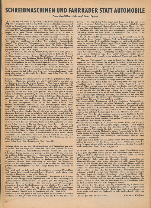 ... Was, insbesondere, tut sich bei Adler? Adler schien von allen ,,Planen den“ am Weitesten voran, denn es stellte bereits im Frühjahr 1948 auf der Exportmesse Hannover das neue Modell seines verbesserten Trumpf- Jnnior aus, das vom Publikum höchst beifällig aufgenommen wurde. Seitdem senkte sich Schweigen über das durch Kriegsschäden stark zer störte Werksgelände in der Heinrich-KIeyer-Straße in Frankfurt a. M., und wenn kürzlich den Adler-Vertretnngen mitgeteilt wurde, daß der neue Trumpf-Jnnior-Motor in Serie gehen soll, um als Austauschmotor für noch laufende Wagen zu dienen, so bedeutet das nicht mehr und nicht weniger, als daß Adler den Bau von Personenkraftwagen wenig stens einstweilen zurückgestellt hat. Dafür baut Adler Fahrräder und — Schreibmaschinen. „ Einem Kaufmann, der seinem Kunden an Stelle des geforderten Bohnen kaffees — Marmelade anbietet, oder ein Textilverkäufer, der statt des gewünschten Mantelstoffs seinem Kunden — Unterhosen andrehen will, wird Mühe haben (seinen Ruf zu erhalten. Es ist unwichtig hier über die Qualitäten der Adler-Schreibmaschinen oder Adler-Fahrräder zu schrei ben. Die Adler - Automobile jedenfalls haben den Ruf des Werkes gegründet, haben das Werk groß gemacht und haben jene Gemeinde treuer Adlerfreunde geschaffen, die nun einmal existiert und nicht weg zuleugnen ist. Ein Automobil ist keine xbeliebige ...