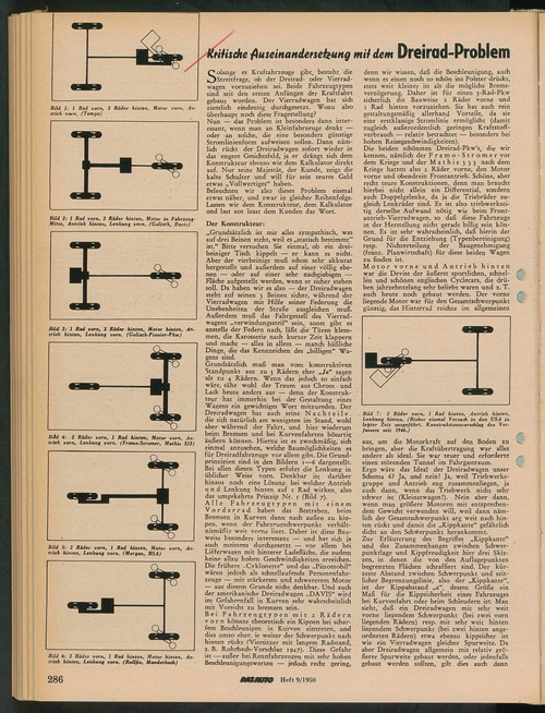 ... an Kleinfahrzeuge denkt — oder an solche, die eine besonders günstige Stromlinienform aufweisen sollen. Dann näm lich rückt der Dreiradwagen sofort wieder in das engere Gesichtsfeld, ja er drängt sich dem Konstrukteur ebenso wie dem Kalkulator direkt auf. Nur seine Majestät, der Kunde, zeigt die kalte Schulter und will für sein teures Geld etwas „Vollwertiges“ haben. Beleuchten wir also dieses Problem einmal etwas näher, und zwar in gleicher Reihenfolge. Lassen wir dem Konstrukteur, dem Kalkulator und last not least dem Kunden das Wort. Der Konstrukteur: „Grundsätzlich ist mir alles sympathisch, was auf drei Beinen steht, weil es „statisch bestimmt“ ist.“ Bitte versuchen Sie einmal, ob ein dreibeiniger Tisch kippelt — er kann es nicht. Aber der vierbeinige muß schon sehr akkurat hergestellt und außerdem auf einer völlig ebe nen — oder auf einer sehr nachgiebigen — Fläche aufgestellt werden, wenn er sicher stehen soll. Da haben wir es also —- der Dreiradwagen steht auf seinen 3 Beinen sicher, während der Vierradwagen mit Hilfe seiner Federung die Unebenheiten der Straße ausgleichen muß. Außerdem muß das Fahrgestell des Vierrad wagens „verwindungssteif“ sein, sonst gibt es anstelle der Federn nach, läßt die Türen klem men, die Karosserie nach kurzer Zeit klappern und macht — alles in allem — manch häßliche Dinge, die das Kennzeichen des „billigen“ ...