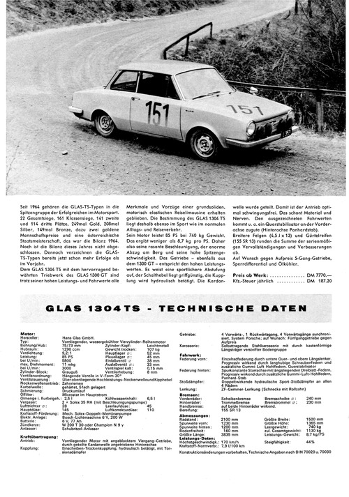 ... Das Getriebe - ebenfalls aus dem 1300 GT - entspricht den hohen Leistungs werten. Es weist eine sportlichere Abstufung auf, der Schalthebel liegt griffgünstig, die Kupp lung wird hydraulisch betätigt. Die Kardan welle wurde geteilt. Damit ist der Antrieb opti mal schwingungsfrei. Das schont Material und Nerven. Den ausgezeichneten Fahrwerten kommt u. a. ein Querstabilisator an der Vorder achse zugute (Hinterachse Panhardstab). Breitere Felgen (4,5Jx13) und Gürtelreifen (155 SR 13) runden die Summe der serienmäßi gen Vervollständigungen und Verbesserungen ab. Auf Wunsch gegen Aufpreis 5-Gang-Getriebe, Sperrdifferential und Ölkühler. Preis ab Werk: DM 7770.— Kfz.-Steuer jährlich M 187.20 GLAS 1304TS TECHNISCHE DATEN Motor: Hersteller: Typ: Bohrung/Hub: Hubraum: Verdichtung: Leistung: bei U/min: max. Drehmoment: bei U/min: Zylinder-Block: Ventilanordnung: Ventilsteuerung: Nockenwellenantrieb: Kurbelwelle: Schmierung: Ölfilter: Ölmenge i. Kurbelgeh. Vergaser: Lufttrichter o : Hauptdüse: Kraftstoff-Förderung: Elektr. Anlage: Batterie: Zündkerze: Anlasser: Kraftübertragung: Antrieb: Hans Glas GmbH. Vornliegender, wassergekühlter Vierzylinder-Reihenmotor 75/73 mm 1290 ccm 9,2:1 85 PS 5800 11 mkg 3000 Grauguß Zylinder-Kopf: Gewicht trocken: Hauptlager 0 : Pleuellager 0: Einlaßventil 0 Auslaßventil 0 : Ventilspiel kalt: ...