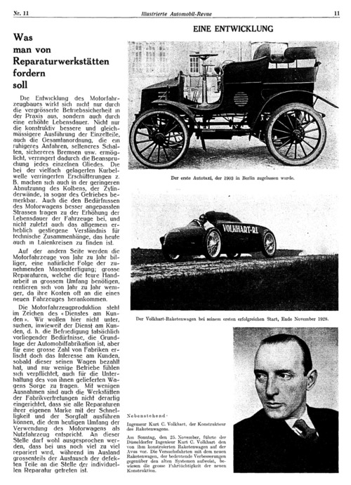 ... billiger, eine natürliche Folge der zunehmenden Massenfertigung; grosse Reparaturen, welche die teure Handarbeit in grossem Umfang benötigen, rentieren sich von Jahr zu Jahr weniger, da ihre Kosten oft an die eines neuen Fahrzeuges herankommen. Die Motorfahrzeugproduktion stehtim Zeichen des «Dienstes am Kunden ». Wir wollen hier nicht unter, suchen, inwieweit der Dienst am Kunden, d. h. die Befriedigung tatsächlich vorliegender Bedürfnisse, die Grundlage der Automobilfabrikation ist, aber für eine grosse Zahl von Fabriken erlischt doch das Interesse am Kunden, sobald dieser seinen Wagen bezahlt hat, und nur wenige Betriebe fühlensich verpflichtet, auch für die Unterhaltung des von ihnen gelieferten Wagens Sorge zu tragen. Mit wenigen Ausnahmen sind auch die Werkstätten der Fabrikvertretungen nicht derartigeingerichtet, dass sie alle Reparaturen ihrer eigenen Marke mit der Schnelligkeit und der Sorgfalt ausführen können, die dem heutigen Umfang der Verwendung des Motorwagens alsNutzfahrzeug entspricht. An dieser Stelle darf wohl ausgesprochen werden, dass bei uns noch viel zu viel repariert wird, während im Auslandgrossenteils der Austausch der defekten Teile an die Stelle d.er individuellen Reparatur getreten ist. Nebenstehend1 Ingenieur Kurt C. Volkhart, der Konstrukteur des Raketenwagens. Am Sonntag, den 25. November, führte der Düsseldorfer Ingenieur ...