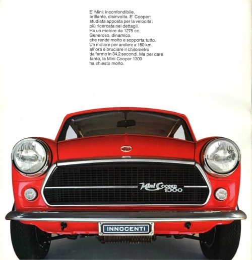 ... Mini: inconfondibile, brillante, disinvolta. E' Cooper: studiata apposta per la velocità; più ricercata nei dettagli. Ha un motore da 1275 ce. Generoso, dinamico, che rende molto e sopporta tutto. Un motore per andare a 160 km. all'ora e bruciare il chilometro da fermo in 34,2 secondi. Ma per dare tanto, la Mini Cooper 1300 ha chiesto molto. *^^^P*% ' ì ' y, ^*%8o INNOCENTI 9 wtammmmmmmm. ...
