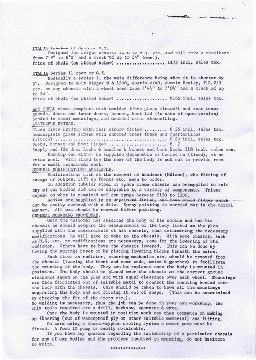 ... (fitted) ...=.... ,.... £ 50 incl. sales tax. Doors, bonnet and boot hinged ,.. £ 7 Supply and fit door locks & handles 6s bonnet and boot locks £10 incl. sales tax. Hardtop can either be supplied detachable or bonded on (fixed), at no extra cost. With fixed top the rear of the body is cut out to provide room for a small occasional seat. GENERAL MODIFICATION1'-: AVAILABLE. Modifications &uch as the removal of headrest (Milano), the fitting of scoops or bulges, lift up fronts etc. made to order. In addition tubular steel or space frame chassis can besupplied to suit any of our bodies and can be adaptable to a variety of components. Prices depend on what is required and can range between £120 to £200. Bodiesare Supplied in an unpainLed finiafeyaud~4i&v<a--in**3t<ir44gea~whiefc can be easily removed with a file. Spray painting is carried out in the normal manner. All wax should be removed before painting. GENERAL MOUNTING PROCEDURE. Once the customer has selected the body of his choice and has his chassis he should compare the measurements of the body listed on the plan supplied with the measurements of his chassis, thus determining the necessary modifications he will have to make to the chassis. With some chassis, such as M.G. etc. no modifications are necessary, save for the lowering of the radiator. Others have to have the ...
