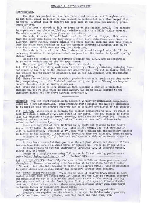 ... components. Suspension is by coil spring/ shocker units0 In size the finished car is between a Sprite and T.R.3, and in appearance is somewhat rerdniscent of the "E" type Jaguar. The advantages of building a car by this method are many: (a) All the body finishing work such as trimming, flooring, v/indows, swinging doors and mounting the body on the chassis are done for you. The kit is fairly complete and enables the purchaser to assemble a car in Ms own workshop with the nininun of equipment, (b) There are no limitations as with a production chassis, such as seating posit ion, suspension, etc, the finished product being not just a fibreglass body on an old chassis, it is virtually a new car. (c) Pricewise it is no more expensive than mounting a body on a production chassis and the resale value is much higher, due in no small measure to the excellent finish and far above average performance. ASSEMBLY: The kit can*be~supplied to accept a variety of nechanical components. Below are a few alternatives. When ordering state clearly the make of components to be used so that the correct brackets can be supplied and fitted to the chassis. (1) M.G.T.C. These would be perhaps the easiest components to use. It would be best to obtain a complete T.C. and strip it for parts. The new chassis is fitted with all brackets to accept motor, gearbox, ...