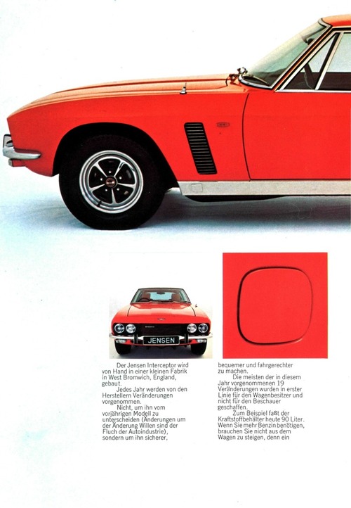 ... Jensen Interceptorwird von Hand in einer kleinen Fabrik in West Bromwich, England, gebaut. Jedes Jahr werden von den Herstellern Veränderungen vorgenommen. Nicht, um ihn vom vorjährigen Modell zu unterscheiden (Änderungen um der Änderung Willen sind der Fluch der Autoindustrie), sondern um ihn sicherer, bequemer und fahrgerechter zu machen. Die meisten der in diesem Jahr vorgenommenen 19 Veränderungen wurden in erster Linie für den Wagenbesitzer und nicht für den Beschauer geschaffen. Zum Beispiel faßt der Kraftstoffbehälter heute 90 Liter. Wenn Sie mehrBenzin benötigen, brauchen Sie nicht aus dem Wagen zu steigen, denn ein ...