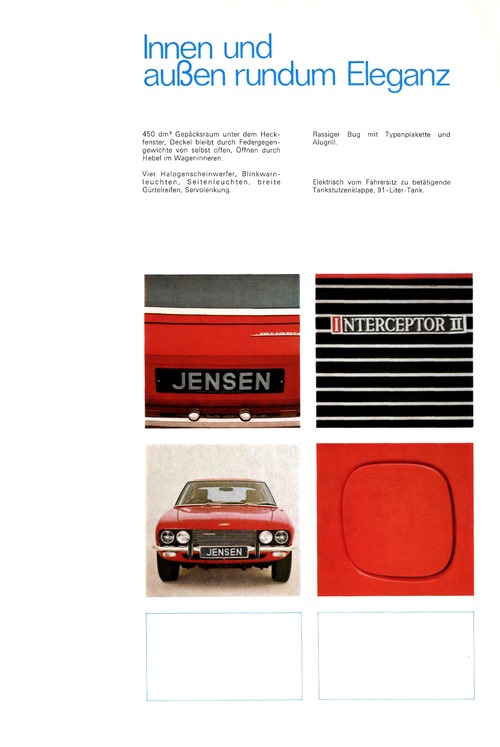 ... und außen rundum Eleganz 450 dm3 Gepäcksraum unter dem Heck fenster, Deckel bleibt durch Federgegen gewichte von selbst offen, Öffnen durch Hebel im Wageninneren. Vier Halogenscheinwerfer, Blinkwarn leuchten, Seitenleuchten, breite Gürtelreifen, Servolenkung. Rassiger Bug mit Typenplakette und Alugrill. Elektrisch vom Fahrersitz zu betätigende Tankstutzenklappe, 91 -Liter-Tank. I NTERCEPTOR H ...