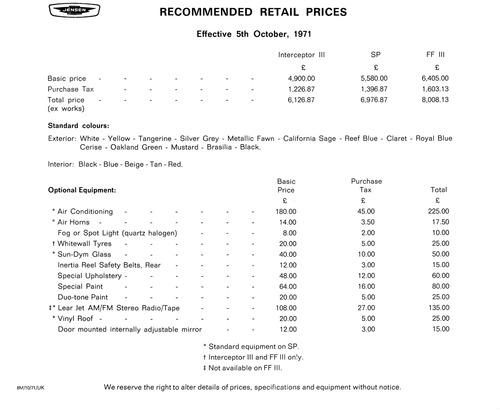 ... price Purchase Tax Total price (ex works) Standard colours: RECOMMENDED RETAIL PRICES Effective 5th October, 1971 Interceptor III SP £ £ 4,900.00 5,580.00 1,226.87 1,396.87 6,126.87 6,976.87 FF III £ 6,405.00 1,603.13 8,008.13 Exterior: White - Yellow - Tangerine - Silver Grey - Metallic Fawn - California Sage - Reef Blue - Claret - Royal Blue Cerise - Oakland Green - Mustard - Brasilia - Black. Interior: Black - Blue - Beige - Tan - Red. Optional Equipment: * Air Conditioning - * Air Horns - Fog or Spot Light (quartz halogen) t Whitewall Tyres - * Sun-Dym Glass - Inertia Reel Safety Belts, Rear Special Upholstery - Special Paint - Duotone Paint - t* Lear Jet AM/FM Stereo Radio/Tape * Vinyl Roof - Door mounted internally adjustable mirror Basic Price £ 180.00 14.00 8.00 20.00 40.00 12.00 48.00 64.00 20.00 108.00 20.00 12.00 * Standard equipment on SP. t Interceptor III and FF III only. t Not available on FF III. Purchase Tax £ 45.00 3.50 2.00 5.00 10.00 3.00 12.00 16.00 5.00 27.00 5.00 3.00 Total £ 225.00 17.50 10.00 25.00 50.00 15.00 60.00 80.00 25.00 135.00 25.00 15.00 8M/10/71/UK We reserve the right to alter details of prices, specifications and equipment without notice. ...
