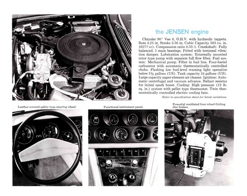 ... JENSEN engine Chrysler 90° Vee 8, O.H.V. with hydraulic tappets. Bore 4.25 in. Stroke 3.38 in. Cubic Capacity 383 cu. in. (6277 cc). Compression ratio 8.50:1. Crankshaft: Fully balanced. 5 main bearings. Fitted with torsional vibra tion damper. Lubrication system: Externally mounted rotor type pump with separate full flow filter. Fuel sys tem: Mechanical pump. Filter in fuel line. Fourbarrel carburetor with automatic thermostatically controlled choke. Flashing low fuellevel warning light operative below SY2 gallons (US). Tank capacity 24 gallons (US). Large capacity paper element air cleaner. Ignition: Auto matic centrifugal and vacuum advance. Ballast resistor for initial spark boost. Cooling: High pressure (13 lb. sq. in.) system with pellet type thermostat. Twin ther mostatically controlled electric cooling fans. Refer to specification sheet for latest variations. Leather covered safety type steering wheel. Functional instrument panel. Powerful ventilated fourwheel Girling disc brakes. ...