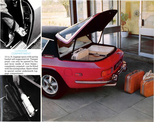 ... COMPARTMENT 12 cu. ft. luggage space with spring loaded selfsupported lid. Tamper proof—can only be opened by key and lever inside of door framecompletely carpeted—can be fitted with fire extinguisher. Spare wheel in special carrier underneath lug gage compartment. ...