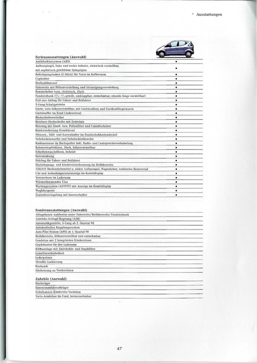 ... Serienausstattungen (Auswahl) Antiblockiersystem (ABS) Außenspiegel, links und rechts beheizt, elektrisch verstellbar, mit asphärisch gewölbtem Spiegelglas Befestigungshaken (2 Stück) für Netze im Kofferraum Cupholder Drehzahlmesser Fahrersitz mit Höhenverstellung und Sitzneigungsverstellung Fensterheber vorn, elektrisch, 2fach Fondsitzbank (V3:2/3 geteilt, umklappbar, entnehmbar, einzeln längs verstellbar) Fullsize-Airbag für Fahrer und Beifahrer 5-Gang-Schaltgetriebe Gurte, vorn höhenverstellbar, mit Gurtstraffern und Gurtkraftbegrenzern Gurtstraffer im Fond (Außensitze) Heckscheibenwischer Heizbare Heckscheibe mit Zeitrelais Heizung mit Staubbzw. Pollenfilter und Umluftschalter Kindersicherung (Fondtüren) Münzen-, Stiftund Kartenhalter im Handschuhkastendeckel Nebelscheinwerfer und Nebelschlußleuchte Radioantenne im Heckspoiler inkl. Radiound Lautsprecherverkabelung Rahmenkopfstützen, 5fach, höhenverstellbar Scheibenwaschdüsen, beheizt Servolenkung Sidebag für Fahrer und Beifahrer Sitzbelegungsund Kindersitzerkennung im Beifahrersitz TIREFIT (Reifendichtmittel u. elektr. Luftpumpe), Wagenheber, wahlweise Reserverad Uhr und Außentemperaturanzeige im Kombidisplay Verzurrösen im Laderaum Wärmedämmendes Glas Wartungssystem (ASSYST) mit Anzeige im Kombidisplay Wegfahrsperre Zentralverriegelung mit Innenschalter ...