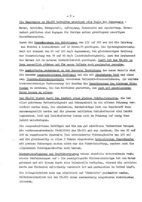 ... 2 - Die Neuerungen am KR-200 "betreffen praktisch, alle Teile des Fahrzeuges : Motor, Getriebe, Fahrgestell, Aufhängung, Karosserie und Ausstattung. Unver ändert geblieben sind dagegen die Vorzüge seiner grundlegend neuartigen Gesamtkonzeption. Duroh die Vergrosserung des Hubvolumens von 175 auf 200 com ist die Leistung des Fichtel & Saohs-Motors auf 10 Brems-PS gestiegen. Die Spitzengeschwindig keit hat dadurch von 80 auf 100 km/h zugenommen, bei gleichzeitiger Erhöhung der Dauerleistung von 75 auf 85 km/h (Autobahnfestigkeit)« Auoh das Drehmoment des Motors ist im unteren Drehzahlbereioh gestiegen. Damit ist der ICR-200 am Berg wesentlich stärker und für unser Gelände noch geeigneter geworden« Die markantestenAenderungen an der äusseren Erscheinung des neuen Modells sind die nunmehr ausgeschnittenen Kotflügel und die mit abnehmbarem Dach und einer sg. Panorma-Windsohutzsoheibe versehenen Vollsicht-Karosseriehaube« Als weitere karosseriemässige Verbesserung ist daneben die Vergrosserung des_ hinteren Sitz raumes zu erwähnen, die dem Mitfahrer gestattet, nun auoh mit geschlossenen Knien bequem zu sitzen. Der KR-200 bietet damit den Komfort einer kleinen Öabrio-Limousine. di bei aller gebotenen Wetterfestigkeit und Geborgenheit in ein offenes Fahrzeug ver wandelt werden kann. Das abnehmbare, durchsichtige Dach aus Kunststoff kann zusammengerollt ...