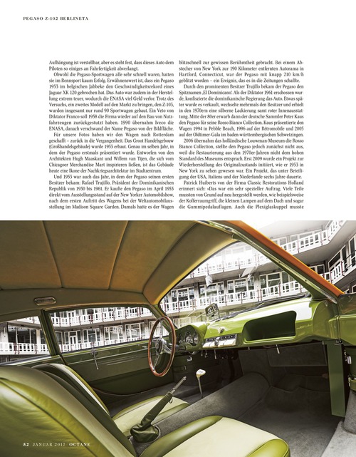 ... Hugh Maaskant und Willem van Tijen, die sich vom Chicagoer Merchandise Mart inspirieren ließen, ist das Gebäude heute eine Ikone der Nachkriegsarchitektur im Stadtzentrum. Und 1953 war auch das Jahr, in dem der Pegaso seinen ersten Besitzer bekam: Rafael Trujillo, Präsident der Dominikanischen Republik von 1930 bis 1961. Er kaufte den Pegaso im April 1953 direkt vom Ausstellungsstand auf der New Yorker Automobilshow, nach dem ersten Auftritt des Wagens bei der Weltautomobilausstellung im Madison Square Garden. Damals hatte es der Wagen blitzschnell zur gewissen Berühmtheit gebracht. Bei einem Abstecher von New York zur 190 Kilometer entfernten Autorama in Hartford, Connecticut, war der Pegaso mit knapp 210 km/h geblitzt worden – ein Ereignis, das es in die Zeitungen schaffte. Durch den prominenten Besitzer Trujillo bekam der Pegaso den Spitznamen ‚El Dominicano‘. Als der Diktator 1961 erschossen wurde, konfiszierte die dominikanische Regierung das Auto. Etwas spä- ter wurde es verkauft, wechselte mehrmals den Besitzer und erhielt in den 1970ern eine silberne Lackierung samt roter Innenausstattung. Mitte der 80er erwarb dann der deutsche Sammler Peter Kaus den Pegaso für seine Rosso Bianco Collection. Kaus präsentierte den Wagen 1994 in Pebble Beach, 1996 auf der Rétromobile und 2005 auf der Oldtimer-Gala im badenwürttembergischen Schwetzingen. ...