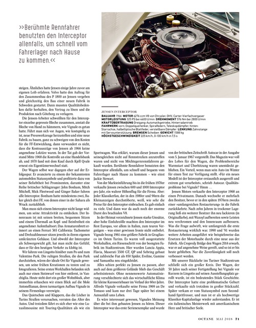 ... zu einem der bekanntesten automobilen Statussymbole und profitierte dazu von seiner Beliebtheit bei Prominenten, darunter eine Reihe britischer Schlagzeuger: John Bonham, Mitch Mitchell, Mick Fleetwood und Ginger Baker fuhren alle Interceptor. Bonham hatte mindestens zwei, Baker gleich drei FF, von denen einer in der Sahara als Wrack zurückblieb. Man muss sich einem Interceptor nicht lange widmen, um seine Attraktivität zu entdecken. Der Innenraum ist mit seinen breiten, bequemen Sitzen und einem Übermaß an Kopfund Beinfreiheit ein angenehmer Aufenthaltsort. Das Armaturenbrett erinnert an einen Ferrari 365 California: Tachometer und Drehzahlmesser sitzen jeweils in ihrem eigenen umkränzten Gehäuse. Und obwohl der Interceptor als Schwergewicht gilt, hat man nicht das Gefühl, dass er für den heutigen Verkehr zu klobig ist. Wir fahren von Lingotto hinüber zum Po und zum Valentino Park. Die ruhigen Straßen, die den Park durchziehen, wären der ideale Ort für Vignale gewesen, um seine frühen Kreationen zu testen und zu fotografieren. Seine ersten Werkhallen befanden sich auch nur einen Steinwurf von hier entfernt, in Vanchiglia. Heute steht dort ein großer Wohnblock, aber immerhin erhaschen wir einen Blick auf die Mole Antonellianan, deren turmartigen Aufbau Vignale in seinem Firmenlogo verewigte. Das Quietschen und Klappern, das die Löcher in ...