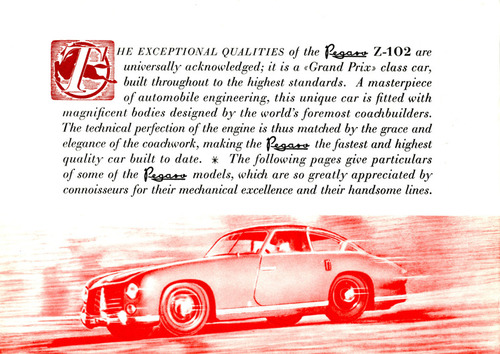 ... EXCEPTIONAL QUALITIES Z-102 are universally acknowledged; it is a «Grand Prix» class car, built throughout to the highest standards. A masterpiece o f automobile engineeringunique car is fitted with magnificent bodies designed by the w orld’s foremost coachbuilders. The technical perfection o f the engine is thus matched by the grace and elegance o f the coachwork, making the the fastest and highest quality car built to date. X The following pages give particulars o f some of the p models, which are so greatly appreciated by connoisseurs for their mechanical excellence and their handsome lines. pWM’*‘** ...