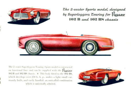 ... 2-seater Sports model, designed (rtf Superteggera touring for 102 It and 102 I5S chassis The 2-seater Superleggera Touring-Sports model is constructed on functional lines and can be supplied with the 102 B and 102 BS chassis, This body fitted to the 102 BS, which develops over 250 b. h. p., makes a light small car, stoutly built, and easily handled, an unrivalled combination which is universally admired. ...