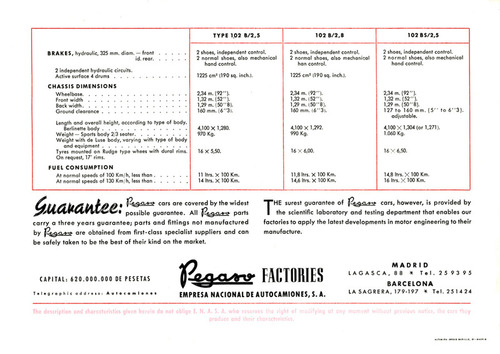 ... ................................................................... 1,32 m. (52 ") . 1,32 m. (52"). 1,32 m. (52 ") . B a c k w i d t h ....................................................................... 1,29 m. (50 "8) . 1,29 m. (5 0 "8 ) . 1,29 m. (50 "8 ) . G r o u n d c l e a r a n c e .......................................................... L en g th a n d o v e r a l l h e i g h t , a c c o r d i n g t o t y p e o f b o d y . 160 mm . (6 "3). 160 mm . (6 "3 ) . 127 t o 160 m m . ( 5 " t o 6 " 3 ) . a d j u s t a b l e . B e r l in e t t e b o d y .......................................................... 4,100 X 1,280. 4,100 X 1,292. 4 ,1 0 0 X 1,304 ( o r 1,271). W e i g h t — S p o r t s b o d y 2/3 s e a t e r .................................... W e i g h t w i t h d e Luse b o d y , v a r y i n g w ith t y p e o f b o d y a n d e q u i p m e n t .......................................................... 970 Kg. 990 Kg. 1.060 K g. T y r e s m o u n t e d o n R u d g e t y p e w h e e s w ith d u r a l rim s. O n r e q u e s t , 17" r im s. 16 X 5,50. 16 X 6,00. 1 6 X 6 ,5 0 . FUEL C O N S U M P T I O N A t n o r m a l s p e e d s o f 100 Km/h, l e s s t h a n ...................... 11 Itrs. X 100 Km. 11,8 ...