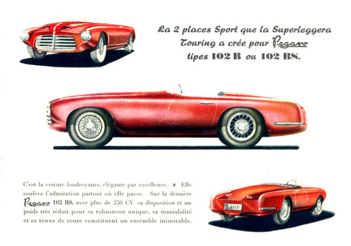 ... 2 places Sport que la Superleggera TZouring a crée pour yU tipes I 0 2 B ou 1 0 2 US. C'est la voiture foudroyante, élégante par excellence. % tëlle soulève l'admiration partout où elle passe. Sur la dernière fl^ya^frtf» 102 BS, avec plus de 250 CV. sa disposition et un poids très réduit pour sa robustesse unique, sa maniabilité et sa tenue de route const i tuent un ensemble inimitable . ...
