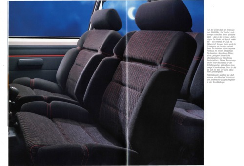 ... r HF V Auf den ersten Blick: ein Innenraum zum Wohlfuhlen. Viel Komfort, hoch wertige Materialien, betont sportliche Optik - alles in Rot, Schwarz, Anthra zitgrau. Der Boden mit Teppich verklei det - das Mittelteil der Sitze mit Veloursstoff bezogen. Vorne sportliche Schalensitze mit stufenlos verstell baren Ruckenlehnen. Hinten bequeme Fondsitze mit einzeln abklappbaren Ruckenlehnen. Gepäckraum-Abdeck plane, genügend Ablagefläche, abschliessbares und beleuchtetes Handschuhfach. Weitere Ausstattungs details: Intervallschaltung für den Scheibenwischer, abblendbarer Innen spiegel, Kartenleselampe. Dazu für alle, die sich mit dem GTI-Sound alleine nicht zufriedengeben: Radio-Einbausatz, bestehend aus: Dach antenne, Anschlusskabel, Entstorsatz und abnehmbaren Lautsprechergittern in den Türverkleidungen. ...