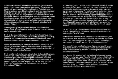 ... von Renn- Kilometern und 25 Jahren „Fahren in seiner schönsten Form". DieserWagen vereinigt in vollendeter Harmonie Leistung mitLuxus. Seine überlegene Technik und sein funktioneller Komfort lassen keinen Wunsch mehr offen -weder beim anspruchsvollsten Fahrer noch beim verwöhntesten Fahrgast. Doch bei aller technischen und ästhetischen Exciusivitat bleibt auch der Turbo ein echter Porsche: Robust, problemlos, alltagsund allwettertauglich, immer zuverlässig und selbst unter härtesten Bedingungen bereit, bewegt zu werden, nicht nur bewundert. Das unterscheidet ihn von den „klassischen" Exoten und macht ihn im Urteil von Perfektionisten und Enthusiasten zum wirklichen Superlativ auf Rädern. Turbocharging and K-Jetronicthis combination of exhaustdriven supercharging and continuous direct fuel injection adds up to the most modern engine investment anybody could make, given our current level of technology. The Optimum use of fuel energy gives an obvious Performance plus which is achieved rationallythis bonus is obtained without increasing capacity and despite lowering both compression ratio and rev figures. What's more this new high in logical Performance also sets fresh Standards for operating silence and reduced emissions dangers. Such levels weren't even thought possible before now: a cultivated boost in Performance which serves ...