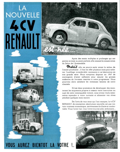 ... 4CV Après des essais multiples et prolongés qui ont permis sa mise au point parfaite, elle connait la consécration du Salon de l'Automobile. FwS&UUù elle ne pourra sortir avant le milieu de l'année prochaine : il faut en effet plusieurs mois pour ache ver l'outillage considérable nécessaire à sa fabrication en très grande série. Nous comptons disposer en 1947 de contingents d'acier suffisants pour assurer les grosses cadences de livraison inscrites à notre programme. Nous pourrons alors satisfaire les immenses besoins de notre clientèle S'il est donc prémature de développer dès main tenant les arguments propres à asseoir votre conviction au sujet de cette remarquable voiture, nous avons voulu néan moins répondre à votre curiosité et alimenter vos rêves pendant quelques mois encore. De l'avis de tous ceux qui l'ont essayée, la 4 CV RENAULT, de conception absolument nouvelle, est une voi ture vraiment économique, extrêmement brillante et confor table. Vous l'avez vue, vous l'avez trouvée jolie, séduisante... VOUS AUREZ BIENTOT LA VOTRE ! ...