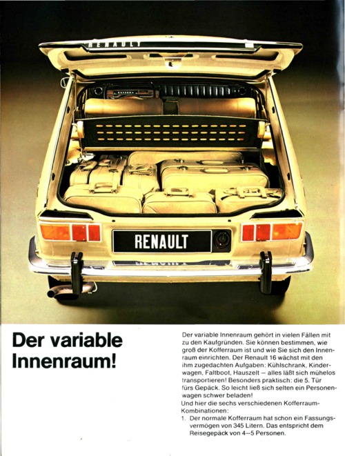 ... variable Innenraum! Der variable Innenraum gehört in vielen Fällen mit zu den Kaufgründen. Sie können bestimmen, wie groß der Kofferraum ist und wie Sie sich den Innen raum einrichten. Der Renault 16 wächst mit den ihm zugedachten Aufgaben: Kühlschrank, Kinder wagen, Faltboot, Hauszelt — alles läßt sich mühelos transportieren! Besonders praktisch: die 5. Tür fürs Gepäck. So leicht ließ sich selten ein Personen wagen schwer beladen! Und hier die sechs verschiedenen Kofferraum- Kombinationen: 1. Der normale Kofferraum hat schon ein Fassungs vermögen von 345 Litern. Das entspricht dem Reisegepäck von 4—5 Personen. ...