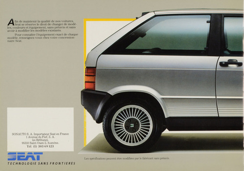 ... \ fin de maintenir la qualité de nos voitures, w m Seat se réserve le dro it de changer de modè les, couleurs et équipement, sans préavis et sans avoir à modifier les modèles existants. Pour connaître l ’équipement exact de chaque modèle, renseignezvous chez votre concession naire Seat. SONAUTO S. A. Importateur Seat en France 1 Avenue du Fief, Z. A. les Béthunes. 95310 Saint-Ouen-L’Aumône. Tél. (1) 303 69 123 T E C H N OL OG I E SANS F RONT I E R E S Les spécifications peuvent être modifiées par le fabricant sans préavis. ...