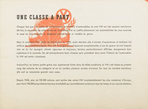 ... CLASSE i Chaque fois que l'on parle de performances en matière d'automobiles, le nom VW est très souvent mentionné. /(( r / r De fait, la réputation de cette voiture est considérable et se justifie pleinement. Les automobilistes les plus autorisés r i - A \et aussi les plus exigeant la désignent comme étant un modèle du genre. Déjà la prer millions de kilo 39, avait derrière elle 4 années d'expériences et totalisait 2,5 s série d'épreuves exceptionnelles, 6 ans de guerre durant lesquels rien en lui fut épargné: climats rigoureux et tropicaux; terrains particulièrement difficiles; chargements bien supérieurs à la normale. De cet extraordinaire banc d’essais, sans précédent dans toute l’histoire de l'automobile, la VW est sortie victorieuse. Aujourd'hui, en bonne partie grâce aux expériences faites dans de telles conditions, la VW s'est hissée au premier rang des voitures de sa catégorie et on lui confère plusieurs années d'avance. Sur tous les marchés mondiaux, elle voit sa renommée grandir sans cesse. Depuis 1945, plus de 100 000 voitures sont sorties des usines VW incontestablement les plus modernes d'Europe, pourfaire 100 000 propriétaires heureux et satisfaits qui journellement roulent partous les temps et sur tous les chemins. ...