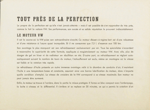 ... PRÈS DE LA PERFECTION Le propre de la perfection est qu’elle n'est jamais atteinte - mais il est possible de s’en rapprocher de très près, comme le fait la voiture VW. Ses performances, son succès et sa solide réputation le prouvent indiscutablement. LE M O T E U R V W Il est la source où la VW puise son extraordinaire vivacité. Ce moteur »Boxer« à régime lent est d’une robustesse et d’une résistance à l’usure quasi incroyable. Et il ne consomme que 7,5 I. d’essence aux 100 km. Son avantage le plus marquant est son refroidissement exclusivement par air. Tous les spécialistes s’accordent à reconnaître la supériorité de cette formule, appliquée si magistralement au moteur VW. Avec elle, plus de danger de gel en hiver ni de radiateur en ébullition en été. D’autre part, ce refroidissement se réglant automatiquement suivant le nombre de tours du moteur, réchauffement est exclu, même en montagne où la vitesse est faible et la rotation très rapide. Le refroidisseur d’huile présente un autre immense avantage: relié à la chambre de conduite d’air, il maintient l’huile à une température basse et constante, assurant ainsi une bonne lubrification du moteur, dans n’importe quelle condition d’emploi. La vitesse de croisière de la VW correspond à sa vitesse maximale. Son moteur ne peut jamais être surmené. Enfin, le moteur se trouve à l’arrière, dans la partie la ...
