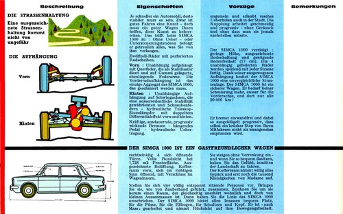 ... - hydraulische Uebertragung. Vorzüge ungemein und erlaubt rasches Ueberholen auch in der Stadt. Die Kupplung arbeitet geschmeidig und progressiv - ohne Geräusch und ohne dass man sie jemals nachstellen müsste. Der SIMCA 1000 vereinigt : geringe Höhe, ausgezeichnete Bodenhaftung und genügende Bodenfreiheit (17 cm). Die 4 unabhängig gefederten Räder werden spielend mit jeder Strasse fertig. Dank seiner ausgewogenen Aufhängung besitzt der SIMCA 1000 eine unvergleichliche Strassenlage. Der SIMCA 1000 ist ein sicherer Wagen. Er bedarf keiner Schmierung mehr, ausser für die Vorderachse, und dort nur alle 20 000 km! Er bremst einwandfrei und dabei so ausgeklügelt progressiv, dass selbst ein brüsker Stop von Ihren Mitfahrern nicht als unangenehm empfunden wird. Bemerkungen DER SIMCA 1000 IST EIN GASTFREUNDLICHER WAGEN rechtwinklig 4 sich öffnende Türen. Volle Rundsicht bei 1,728 m2 Fensterfläche. Aus gezeichnete Relüftung. Koffer raum vorn, sich im richtigen Sinn öffnend, mit Verschluss im Wageninnern. Sie steigen ohne Verrenkung ein - und wenn Sie so bequem dasitzen, haben Sie das Gefühl, inmitten der Landschaft zu fahren. Der Kofferraum nimmt willig alles Gepäck und erst noch die tausend Kleinigkeiten von Madame auf. Stellen Sie sich vier völlig entspannt sitzende Personen vor. Bringen Sie sie, wie von Zauberhand geführt, zusammen. ...