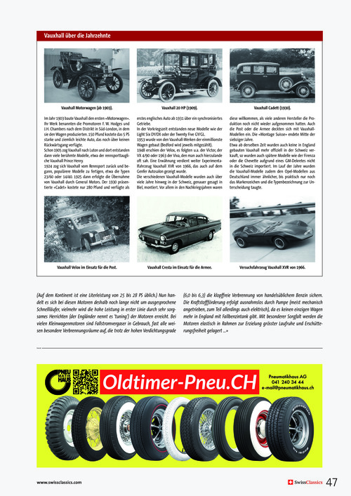 ... F. W. Hodges und J.H. Chambers nach dem Distrikt in Süd-London, in dem sie den Wagen produzierten. 150 Pfund kostete das 5 PS starke und ziemlich leichte Auto, das noch über keinen Rückwärtsgang verfügte. Schon 1905 zog Vauxhall nach Luton und dort entstanden dann viele berühmte Modelle, etwa der rennsporttaugliche Vauxhall Prince Henry. 1924 zog sich Vauxhall vom Rennsport zurück und begann, populärere Modelle zu fertigen, etwa die Typen 23/60 oder 14/40. 1925 dann erfolgte die Übernahme von Vauxhall durch General Motors. Der 1930 präsentierte «Cadet» kostete nur 280 Pfund und verfügte als erstes englisches Auto ab 1931 über ein synchronisiertes Getriebe. In der Vorkriegszeit entstanden neue Modelle wie der Light Six DY/DX oder der Twenty Five GY/GL. 1953 wurde von den Vauxhall-Werken der einmillionste Wagen gebaut (Bedford wird jeweils mitgezählt). 1948 erschien der Velox, es folgten u.a. der Victor, der VX 4/90 oder 1963 der Viva, den man auch hierzulande oft sah. Eine Erwähnung verdient weiter Experimentalfahrzeug Vauxhall XVR von 1966, das auch auf dem Genfer Autosalon gezeigt wurde. Die verschiedenen Vauxhall-Modelle wurden auch über viele Jahre hinweg in der Schweiz, genauer gesagt in Biel, montiert. Vor allem in den Nachkriegsjahren waren diese willkommen, als viele anderen Hersteller die Produktion noch nicht wieder aufgenommen ...