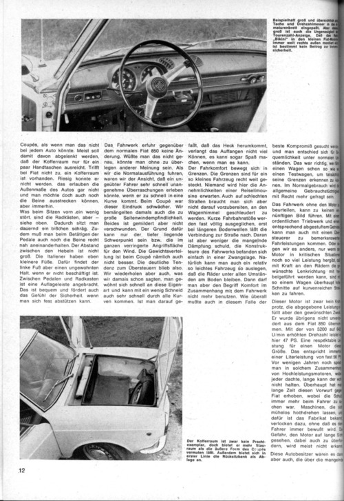 ... derung. Wüßte man das nicht ge nau, könnte man ohne zu über legen anderer Meinung sein. Als wir die Normalausführung fuhren, waren wir der Ansicht, daß ein un geübter Fahrer sehr schnell unan genehme Überraschungen erleben könnte, wenn er zu schnell in eine Kurve kommt. Beim Coupe war dieser Eindruck schwächer. Wir bemängelten damals auch die zu große Seitenwindempfindlichkeit. Beides ist gemildert aber nicht verschwunden. Der Grund dafür kann nur der tiefer liegende Schwerpunkt sein bzw. die im ganzen verringerte Angriffsfläche für den Wind. Die Gewichtsvertei lung ist beim Coupe nämlich auch nicht besser. Die deutliche Ten denz zum Übersteuern blieb also. Wir wiederholen aber auch, was wir damals schon sagten, man ge wöhnt sich schnell an diese Eigen art und kann mit ein wenig Schneid auch sehr schnell durch alle Kur ven kommen. Ist man darauf ge faßt, daß das Heck herumkommt, verlangt das Auffangen nicht viel Können, es kann sogar Spaß ma chen, wenn man es kann. Der Fahrkomfort bewegt sich in Grenzen. Die Grenzen sind für ein so kleines Fahrzeug recht weit ge steckt. Niemand wird hier die An nehmlichkeiten einer Reiselimou sine erwarten. Auch auf schlechten Straßen braucht man sich aber nicht darauf vorzubereiten, an den Wagenhimmel geschleudert zu werden. Kurze Fahrbahnstöße wer den fast völlig ausgeglichen, erst bei längeren ...