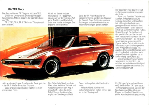 ... TR 7 Story Die Geschichte des TR 7 begann mit dem TR 1. Er war der Urvater eines großen Sportwagen- Geschlechtes. Mit ihm begann die legendäre Serie derTR's. TR 2, TR 3, TR 4, TR 5, TR 6 - ein Triumph nach dem anderen. Als wir vor Jahren mit der Planung des TR 7 begannen, standen wir vor der reizvollen Auf gabe, Tradition und Fortschritt unter eine Haube zu bringen. Das Ergebnis sehen Sie hier: So ist der TR 7 kein Klassiker im klassischen Sinne, sondern ein Klassiker der Neuzeit. Einer Zeit, in der an einen Sportwagen und seine Konstrukteure neue Anforderungen gestellt werden. Jetzt wurde der jüngste Sproß aus der Taufe gehoben - der TR 7. Wieder ein echter Triumph. Beste englische Sportwagen-Tradition in ihrer modernsten Form. Das Sicherheits-Sportcoupe der 80er Jahre. Keilform, Technik und Ausstattung weisen den Weg in die Zukunft - aber das echte Fahr-Erlebnis des klassischen englischen Sportwagens bleibt. Denn Leistung allein zählt heute nicht mehr, Wirtschaftliche Aspekte und Sicherheits-Kriterien rücken immer stär ker in den Vordergrund. Der besondere Reiz des TR 7 liegt im harmonischen Zusammenspiel der Kräfte. Form und Funktion, Technik und Komfort, Wirtschaftlichkeit und Leistung, Sicherheit und Sportlich keit bilden eine kraftvolle, aus gewogene Einheit. Nichts ist dem Zufall überlassen - jeder optische Effekt hat ...